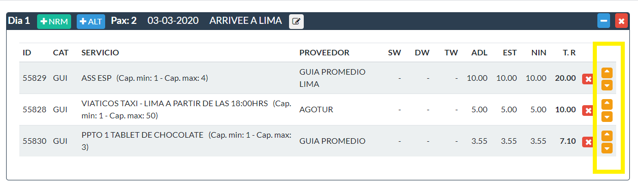 Las tarifas de un día específico se pueden mover para mantener coherencia en las actividades que se van a realizar en el menú de días correlativos