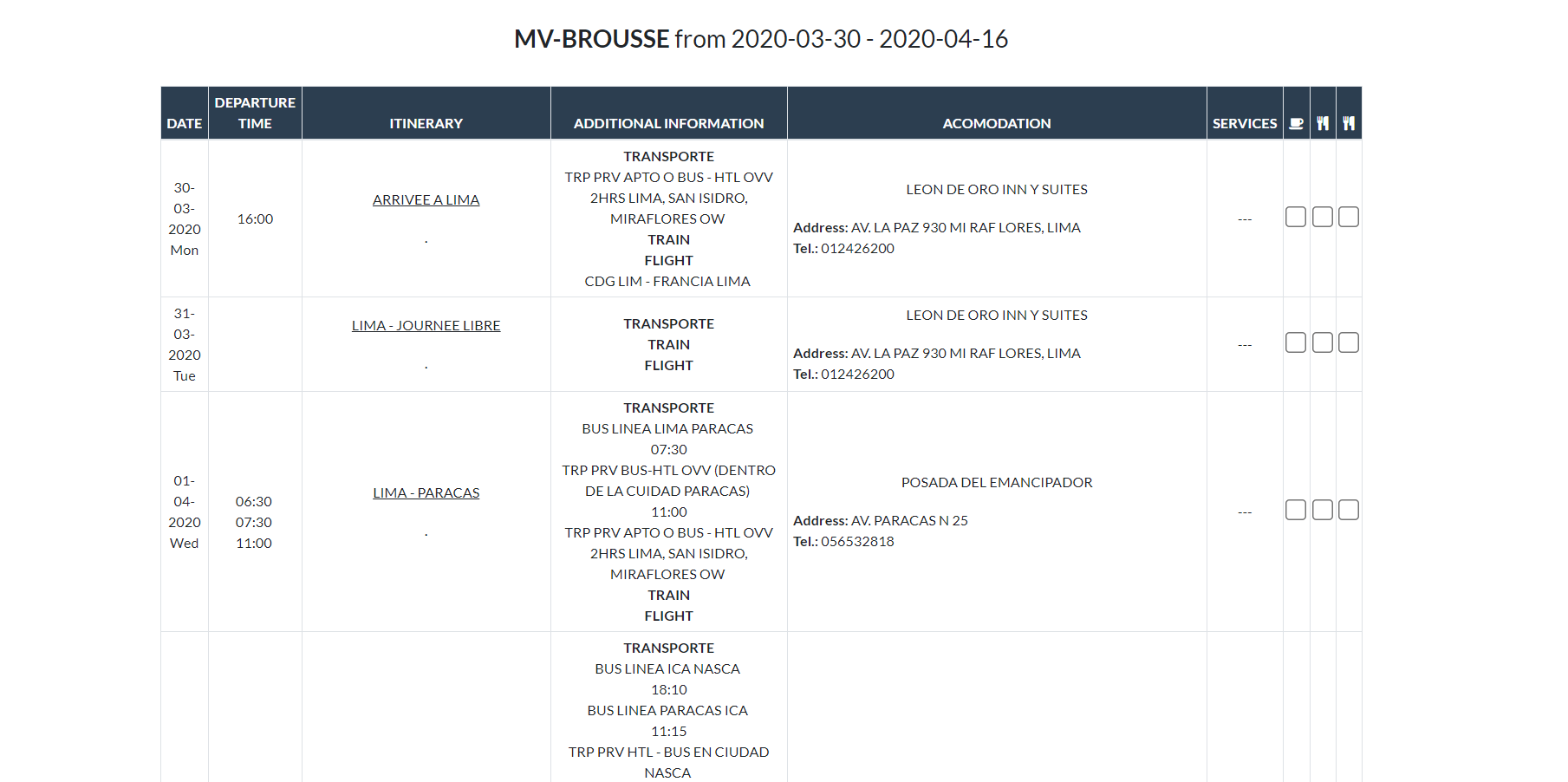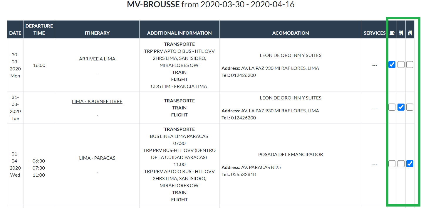 Podremos seleccionar si en un servicios estara incluido Desayuno, Almuerzo y Cena.