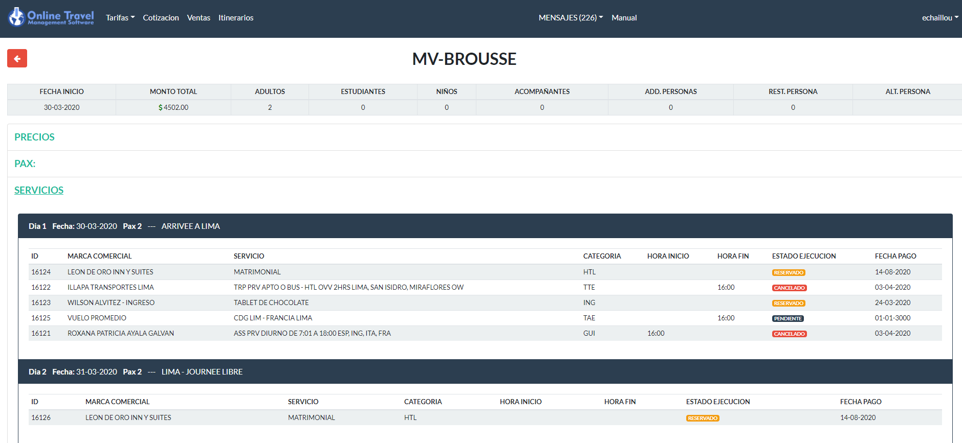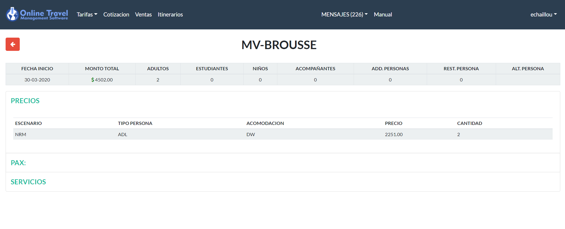 A continuación nos mostrara los detalles del file, en esta parte se podra visualizar el Precio, los pasajeros(PAX) y los servicios del file.