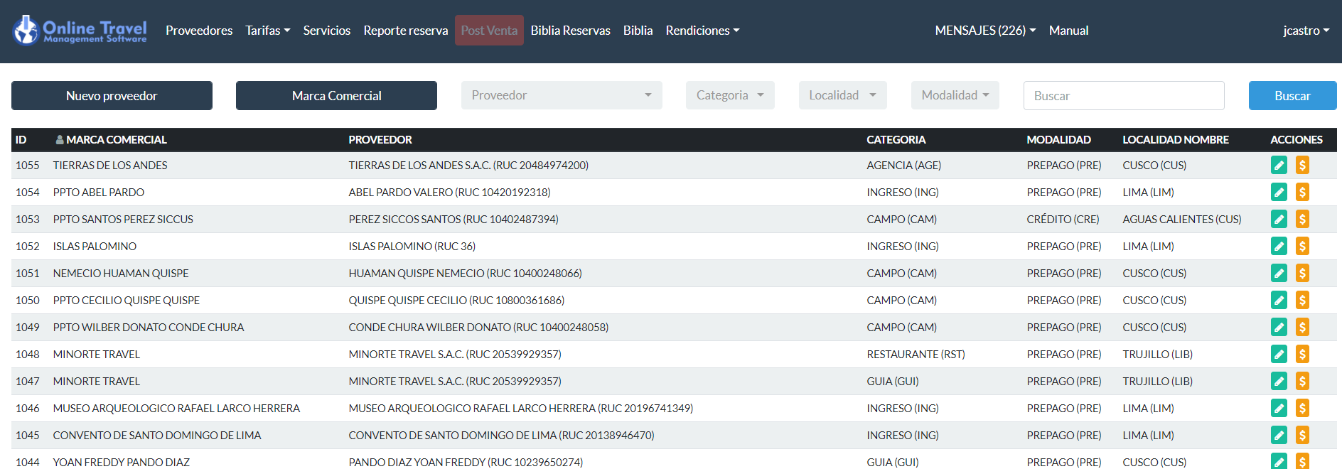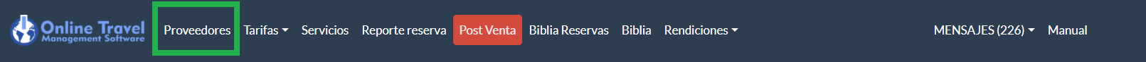 El módulo de Proveedores del menú principal permite ver, crear y buscar Proveedores para asignarles sus tarifas correspondientes: