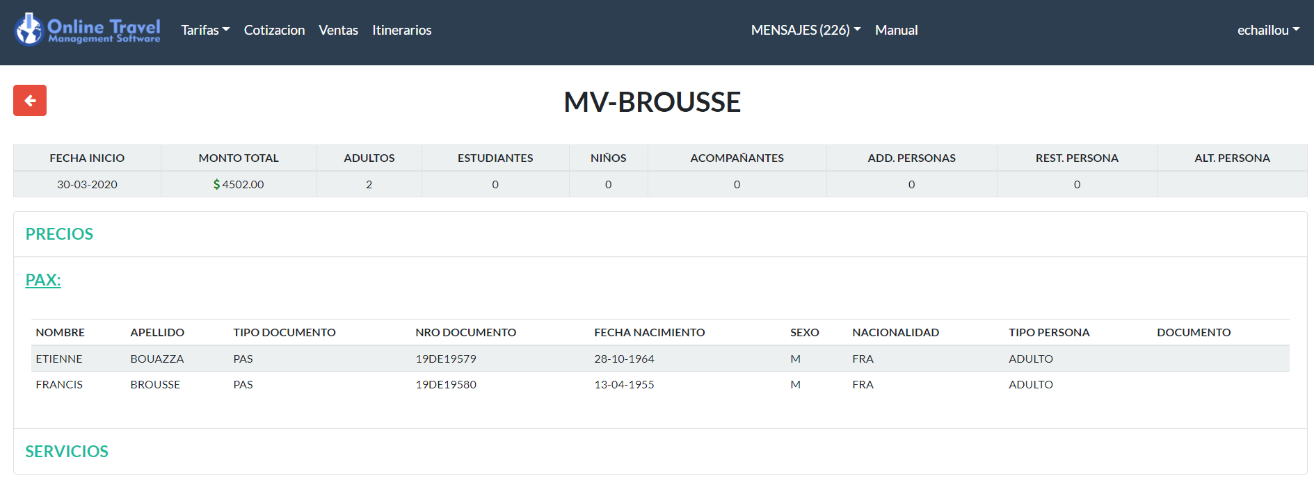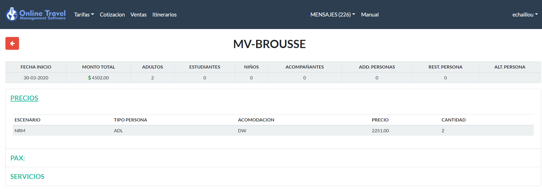 A continuación nos mostrara los detalles del file, en esta parte se podra visualizar el Precio, los pasajeros(PAX) y los servicios del file.
